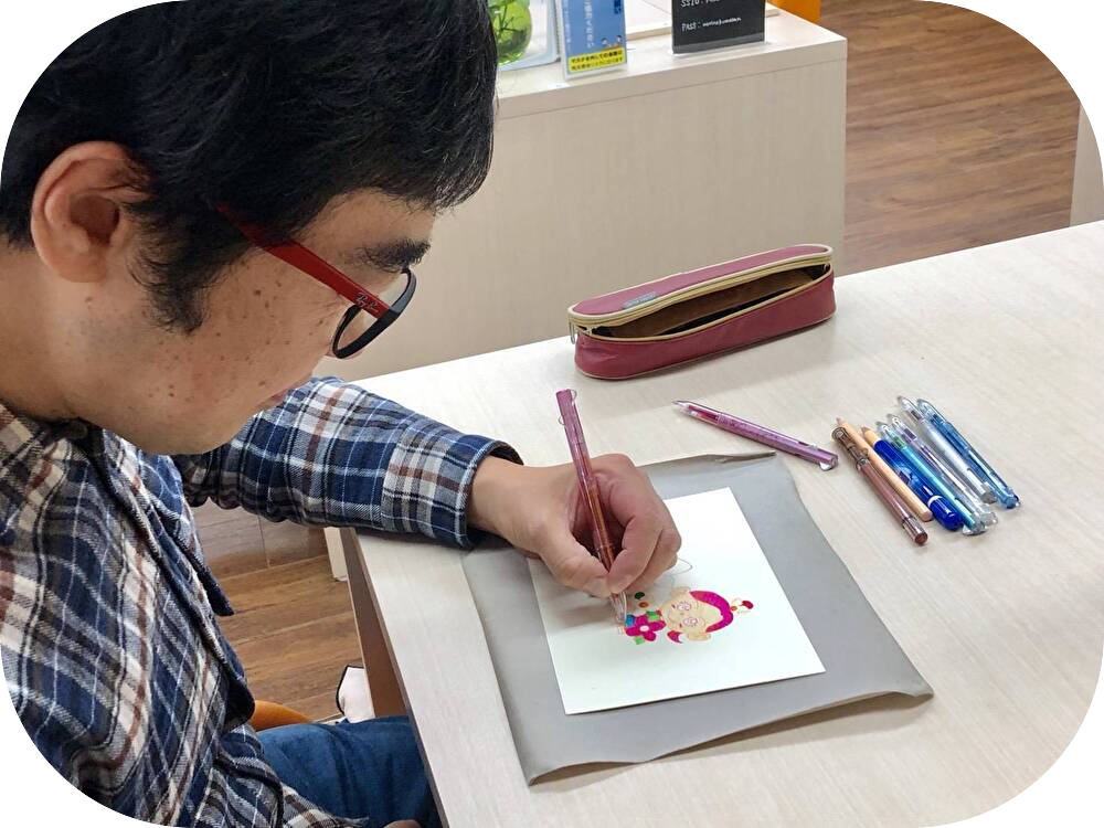 現在はボールペンを使い「見た人が温かく優しい気持ちになれるように」をモットーに描いている。